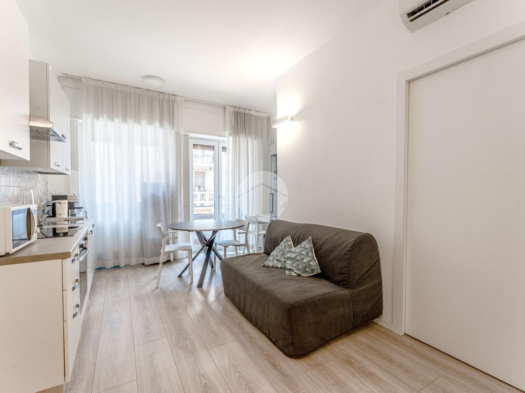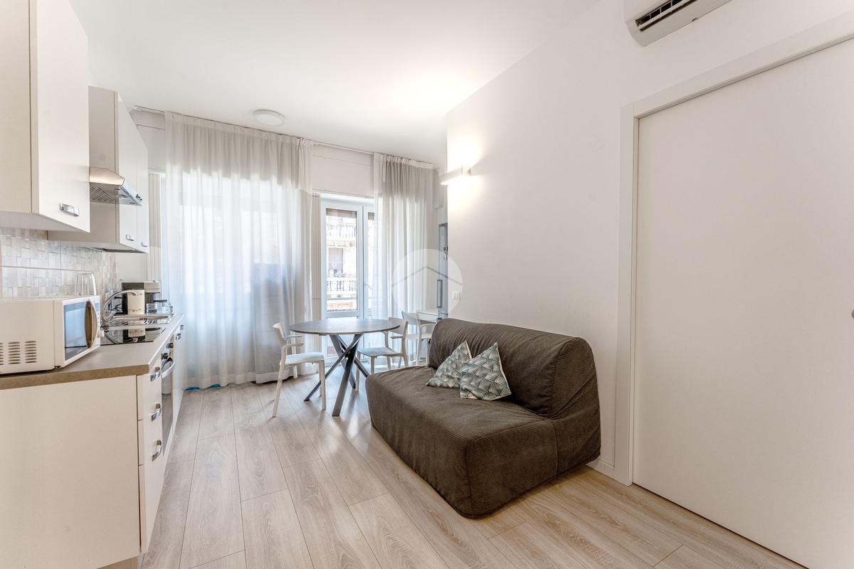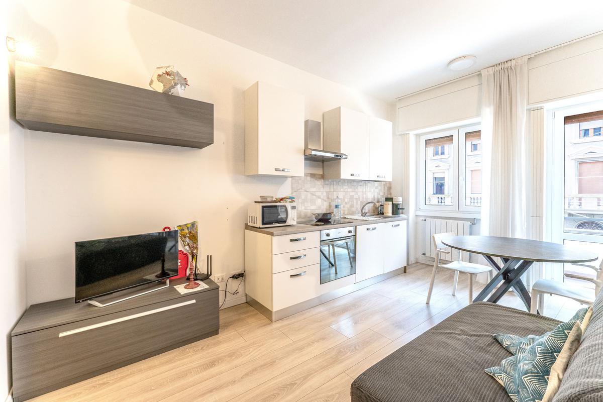 L'immobile si trova al primo piano di uno stabile civile degli anni '60 con servizio di portineria e doppi ascensori. L'appartamento è di recente realizzazione, ed è composto da zona giorno con cucina a vista completa di elettrodomestici, divanoletto e zona studio, e camera da letto con cabina armadio. Completano l'immobile, il bagno cieco con doccia. I pavimenti sono in parquet chiaro, gli infissi in doppio vetro,e le tapparelle sono elettriche. L'immobile è dotato di riscaldamento centralizzato e climatizzazione. L'impiantistica è stata realizzata nuova 5 anni fa.