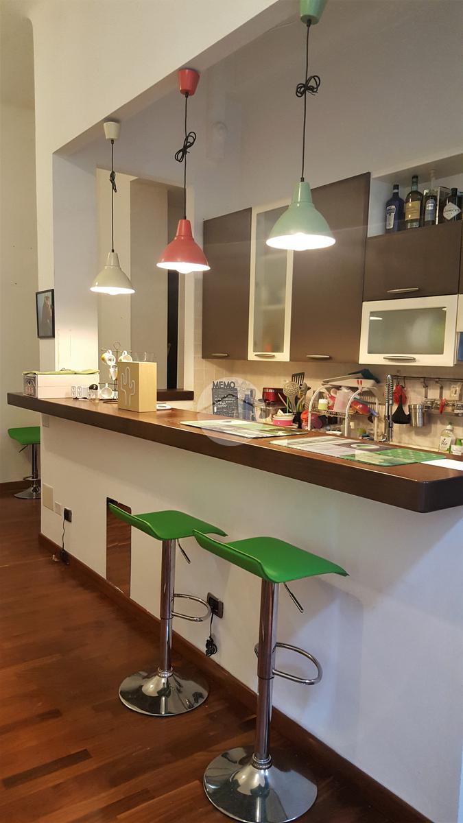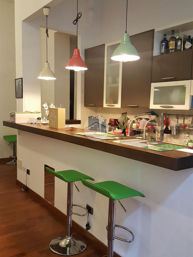 L’ingresso dà sul corridoio che si apre sulla zona giorno illuminata da due finestre che sfruttano l’altezza dei soffitti e caratterizzata da un bancone che separa la cucina dalla zona living e che serve anche da punto d’appoggio per la colazione o un pasto veloce.
