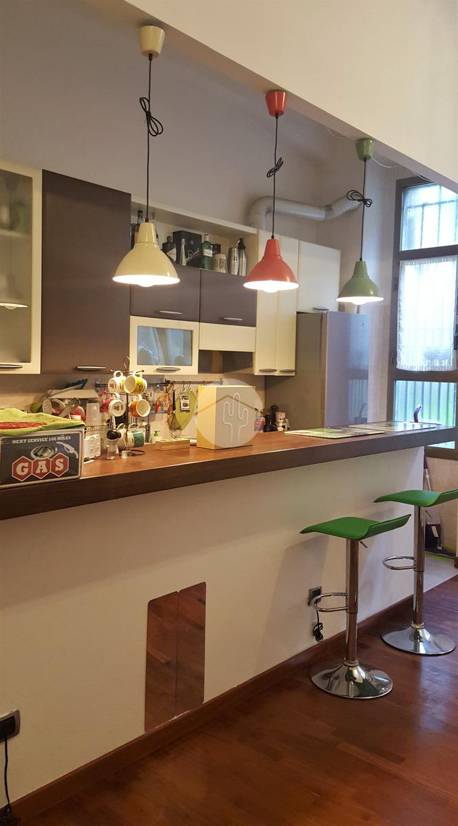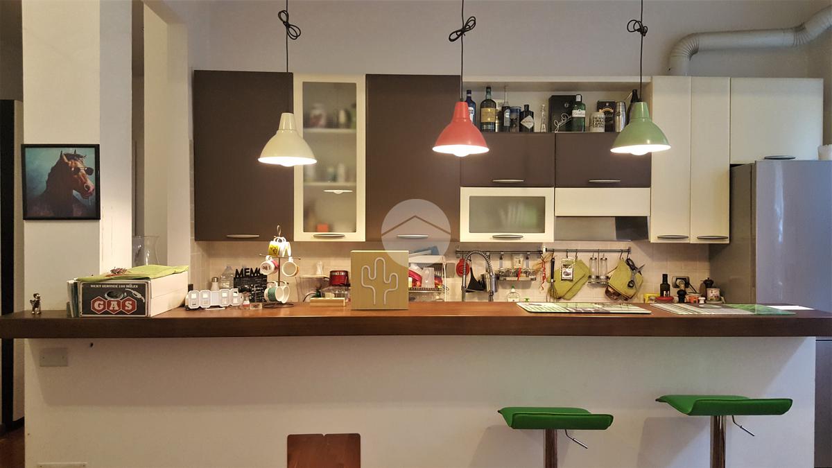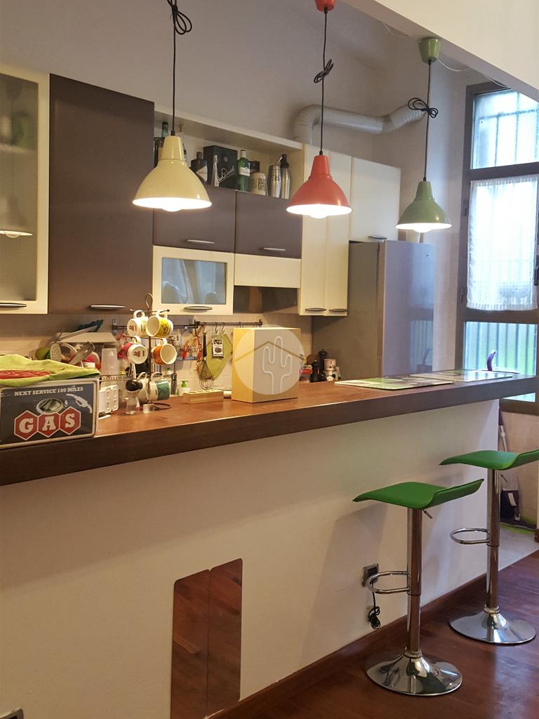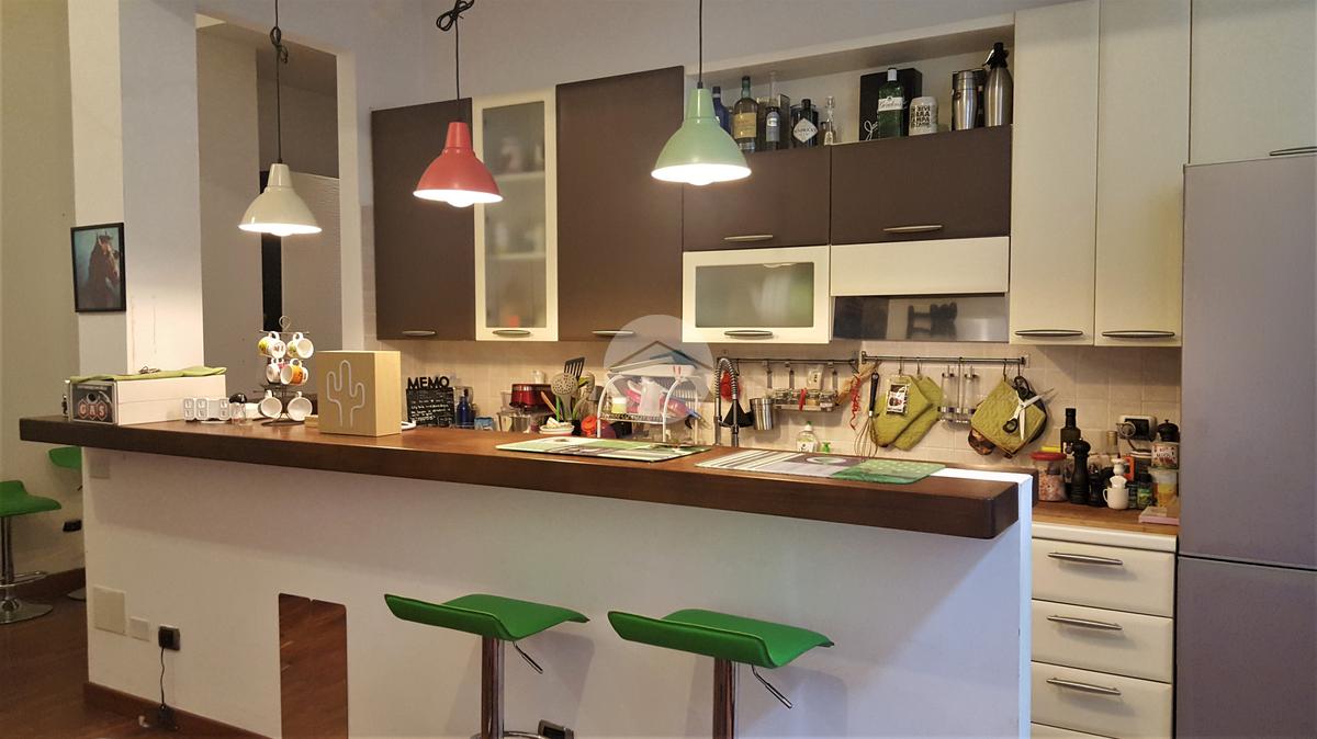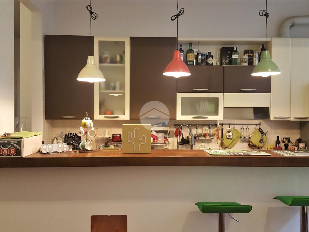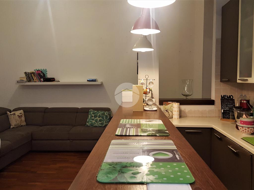 L’ingresso dà sul corridoio che si apre sulla zona giorno illuminata da due finestre che sfruttano l’altezza dei soffitti e caratterizzata da un bancone che separa la cucina dalla zona living e che serve anche da punto d’appoggio per la colazione o un pasto veloce.