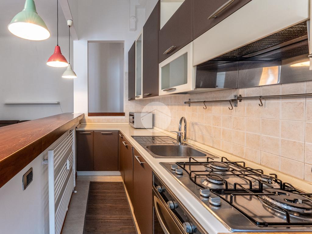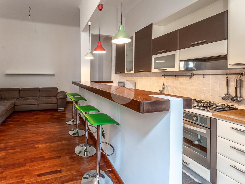 L’ingresso dà sul corridoio che si apre sulla zona giorno illuminata da due finestre che sfruttano l’altezza dei soffitti e caratterizzata da un bancone che separa la cucina dalla zona living e che serve anche da punto d’appoggio per la colazione o un pasto veloce.